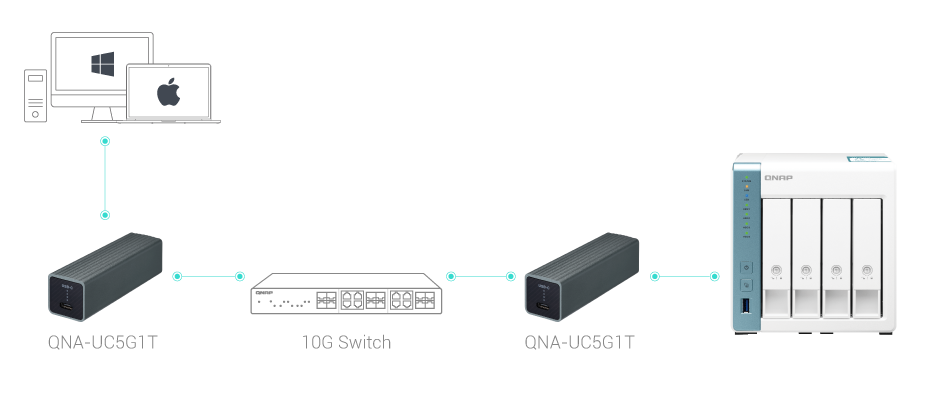 Вы можете использовать адаптеры QNAP с портами USB 3.2 Gen 1 и 5 Гбит/c (QNA-UC5G1T) на сетевых накопителях D4 (Rev. B) и ваших компьютерах. Подключив NAS к ПК через адаптеры 5 Гбит/c, вы можете создать сетевое соединение со скоростью передачи данных почти 300 МБ/с.