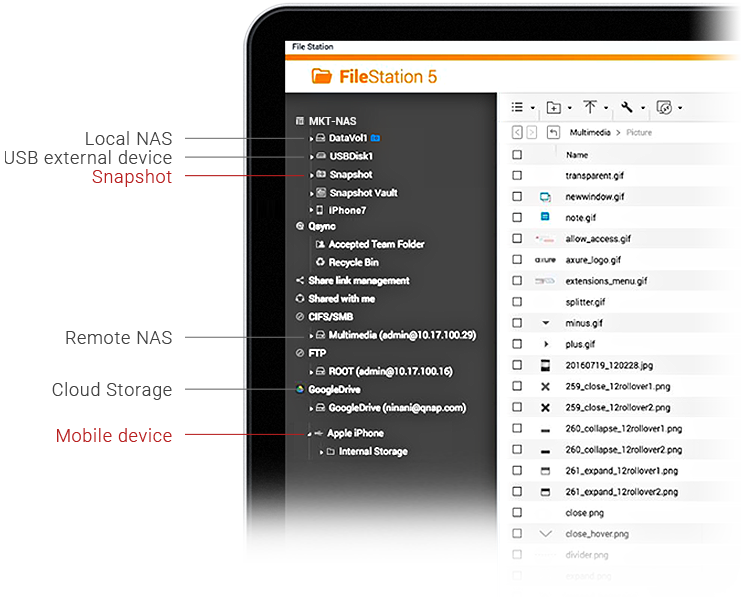 | QNAP File Station обеспечивает централизованное управление файлами, позволяя просматривать и управлять файлами на D4 (Rev. B) и других источниках хранения или внешних устройствах подключенным к сетевому накопителю, чтобы легко обмениваться файлами с семьей и друзьями по электронной почте, в социальных сетях или по прямым ссылкам. | ![]() |