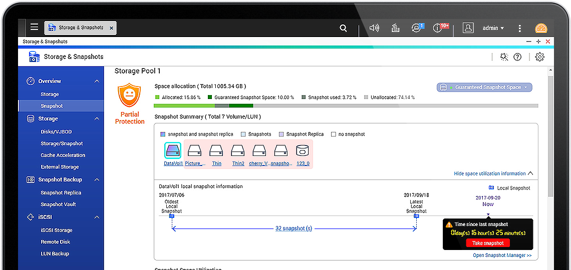 Мгновенные снимки помогают защитить ваши данные за счет полной записи состояния системы NAS и метаданных. Если файл был случайно удален или изменен, вы легко можете восстановить их до ранее записанного состояния из Диспетчера хранилища и моментальных снимков или File Station. Мгновенные снимки QNAP работают на блочном уровне и записывают только измененные данные. Это не только экономит место для хранения, но и сокращает время, необходимое для резервного копирования и восстановления данных. D4 (Rev. B) поддерживает до 16 снимков на том/LUN, и до 32 снимков на устройство.