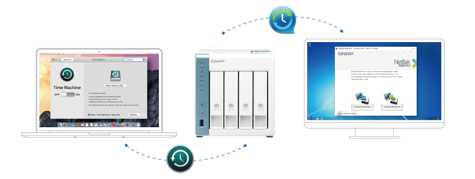 QNAP NAS предоставляет простое решение для резервного копирования и восстановления данных для ноутбуков и настольных компьютеров. QNAP NetBak Replicator можно использовать для резервного копирования файлов на компьютерах Windows®, включая архив электронной почты Outlook®. NAS также поддерживает Time Machine® на устройствах Mac®, обеспечивая легкое, быстрое и удобное резервное копирование данных.