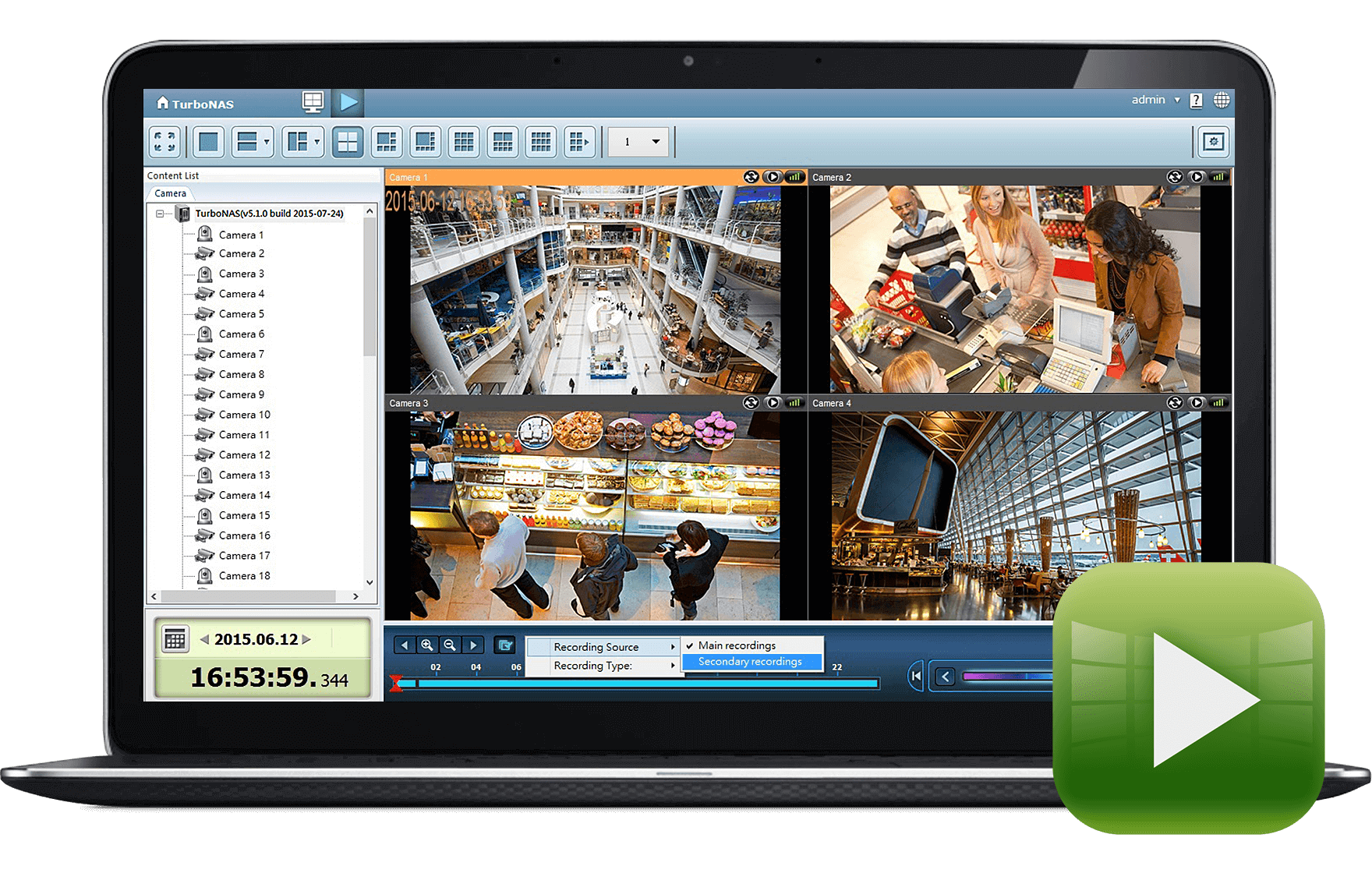 Surveillance Station — это приложение для организации системы видеонаблюдения, которое имеет удобный интерфейс, поддерживает более 3000 совместимых IP-камер, а количество подключенных каналов может быть расширено за счет дополнительных лицензий. Такое решение на базе NAS позволяет создать комплексную систему наблюдения для просмотра в реальном времени, записи и воспроизведения архивных видео и звука. Также вы можете использовать приложение Vmobile на своих мобильных устройствах для управления в любое время и в любом месте.
