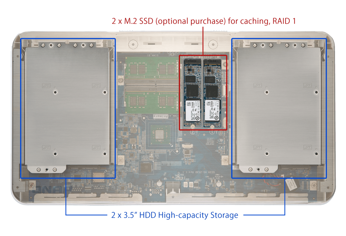 HS-453DX объединяет в одном корпусе слоты под накопители различного формата, такие как M.2 SATA, 2,5-дюймовые SSD и 3,5-дюймовые HDD для построения сбалансированного решения с поддержкой многоуровневого хранения. Два слота для компактных и надежных накопителей формата M.2, а также еще два слота под 2,5-дюймовые SSD или 3,5-дюймовые HDD позволяют как гибко организовать SSD-кэш, так и просто разместить данные для повышенной скорости ввода/вывода. Применение SSD-кэша не только значительно повышает производительность системы в целом, но и является наилучшим выбором для приложений виртуализации, где характерна обработка случайных IOPS-запросов.