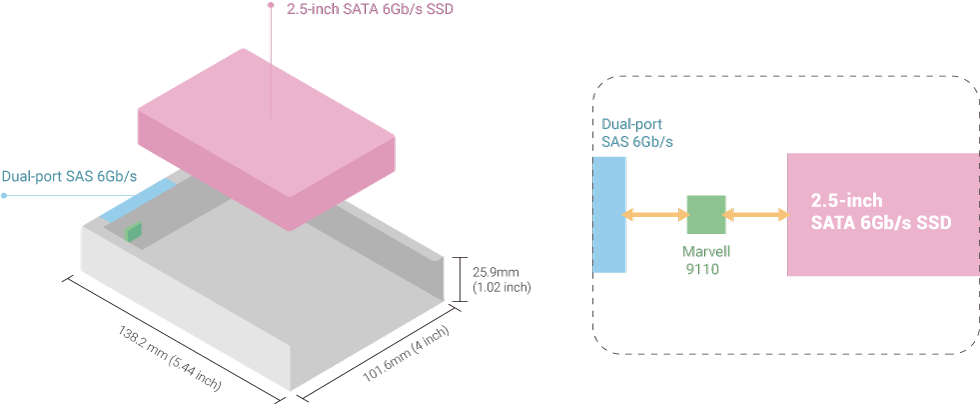 Двухканальный интерфейс SAS служит для организации дискового пространства без единой точки отказа для более высокой надежности и производительности. Хотя твердотельные накопители SATA 6 Гбит/с обеспечивают высокопроизводительное и доступное дисковое пространство, одноканальный SATA интерфейс делает их непригодными для двухконтроллерных устройств. QDA-SA2 решает эту проблему и теперь вы можете использовать SATA SSD в двухконтроллерных СХД QNAP или серверах, чтобы совместить преимущества SAS для обеспечения отказоустойчивой корпоративной среды хранения данных с высокой доступностью SATA.