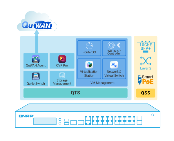 QGD-1602P с операционной системой QTS является первой в мире серией PoE-коммутаторов с поддержкой виртуальных машин, контейнеров и облачных приложений, что помогает реализовать разнообразные сетевые проекты и решения для хранения данных. QGD-1602P оснащен двумя процессорами, которые обеспечивают независимую работу управления сетевыми интерфейсами (QSS — QNAP Switch System) и QTS, отвечающую за виртуализацию и хранение данных. Используя сетевой виртуальный коммутатор, данные из QTS и QSS могут передаваться по интрасети, что ускоряет вычисления между конечными устройствами и хостами.