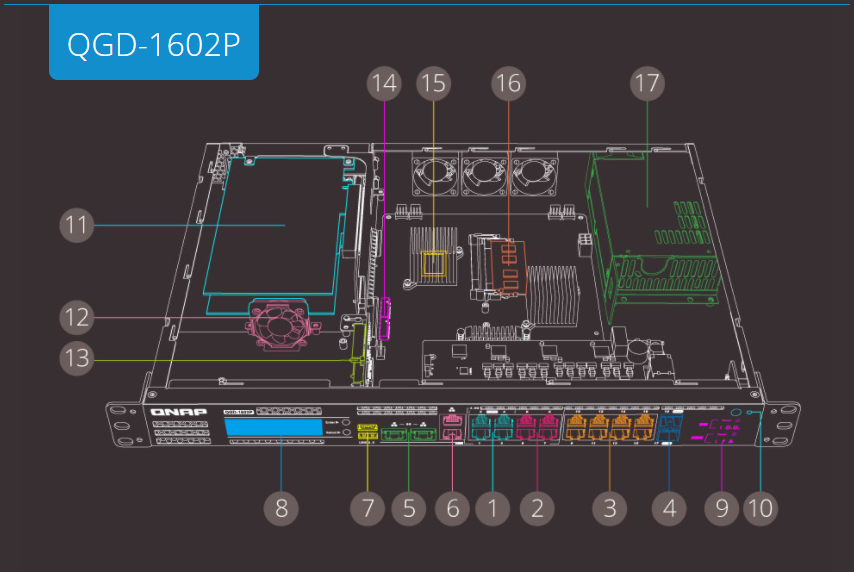 QGD-1602P оснащен многоядерным процессором Intel® Atom® C3000 с тактовой частотой 2,2 ГГц, двумя 2,5-дюймовыми отсеками для дисков SATA и двумя слотами для твердотельных накопителей M.2 NVMe (оптимальны для создания кэша), чтобы обеспечить высокую производительность операций ввода-вывода. Два слота PCIe Gen3 x4 предназначены под дополнительные карты расширения: сетевые адаптеры 10 Гбит/c, карты QM2 со слотами M.2 SSD и портами 10 Гбит/c, карты USB 3.2 Gen 2 (10 Гбит/с) и Wi-Fi адаптеры. Также для повышения производительности IPsec VPN поддерживается технология Intel® QuickAssist (Intel® QAT).