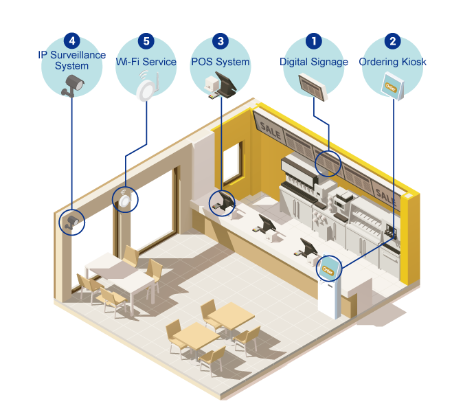 - Цифровые вывески и пункты самообслуживания: на базе сетевых PoE-портов с питанием до 90 Вт можно обеспечить работу разнообразных устройств, таких как информационные и интерактивные стенды.