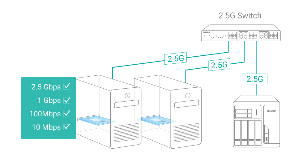 QM2-2P2G2T оснащена двумя сетевыми портами 2,5 GBASE-T Multi-Gigabit с поддержкой скоростей 2,5 и 1 Гбит/c, а также 100 и 10 Мбит/c, таким образом, она может работать в существующей инфраструктуре, при этом при необходимости можно легко перейти на 2,5 Гбит/c.