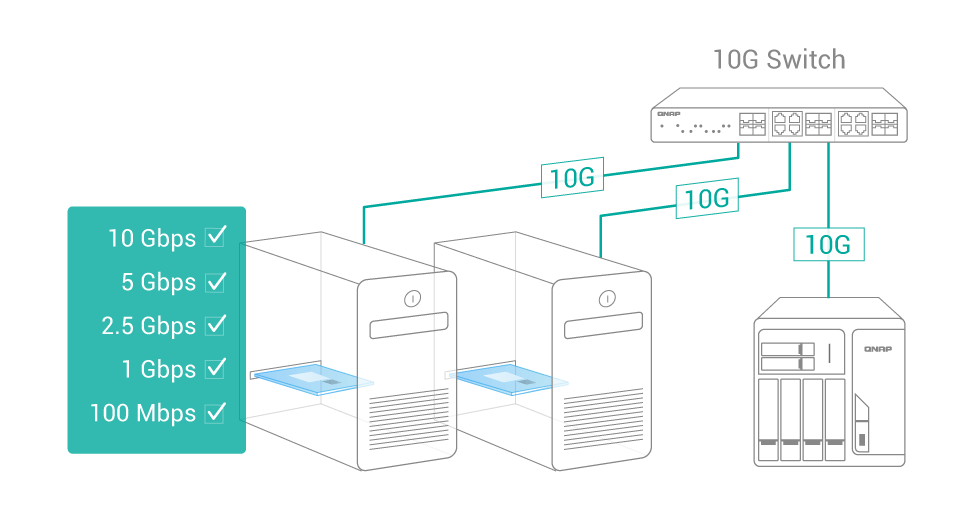 QM2-2P410G1T оснащена сетевым портом 10 GBASE-T Multi-Gigabit с поддержкой скоростей 10/5/2,5/1 Гбит/c, а также 100 и 10 Мбит/c, таким образом, она может работать в существующей инфраструктуре, при этом при необходимости можно легко перейти на 10 Гбит/c.