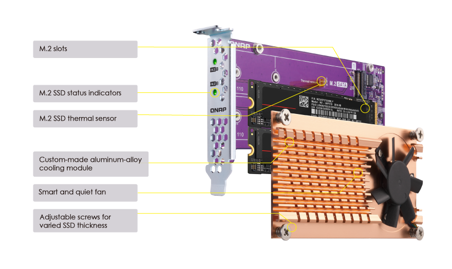 Карта QM2 повышает эффективность системы за счет добавления твердотельных накопителей M.2, при этом основные дисковые отсеки 3,5-дюйма остаются свободными для вместительных HDD, благодаря чему можно добиться максимальной емкости при высокой производительности.
