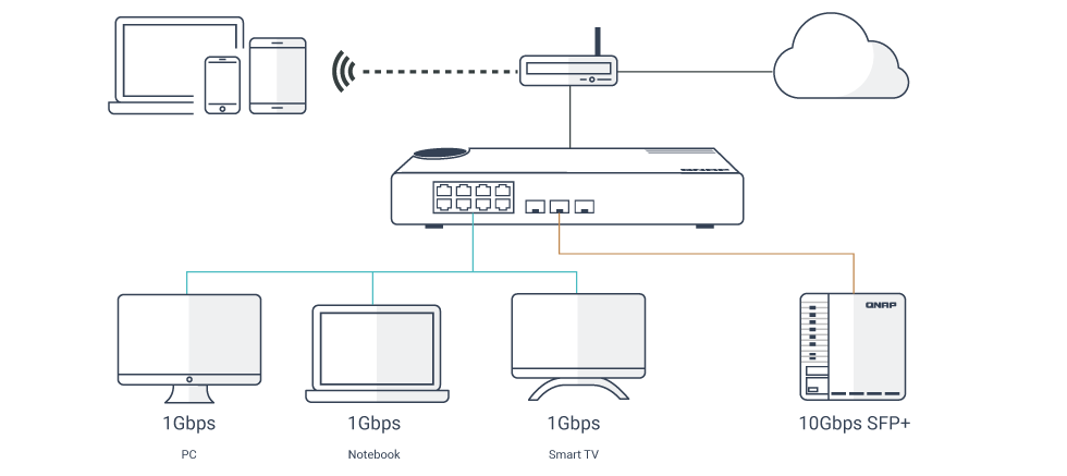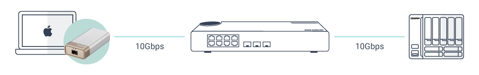 QNAP предлагает широкий спектр сетевых устройств, с помощью которых корпоративные и домашние пользователи могут построить инфраструктуру хранения и обмена данными через соединения на скорости 10 Гбит/с. Через адаптер-переходник от Thunderbolt 3 к 10GbE можно подключить компьютеры, ноутбуки и другие устройства без встроенных сетевых портов.