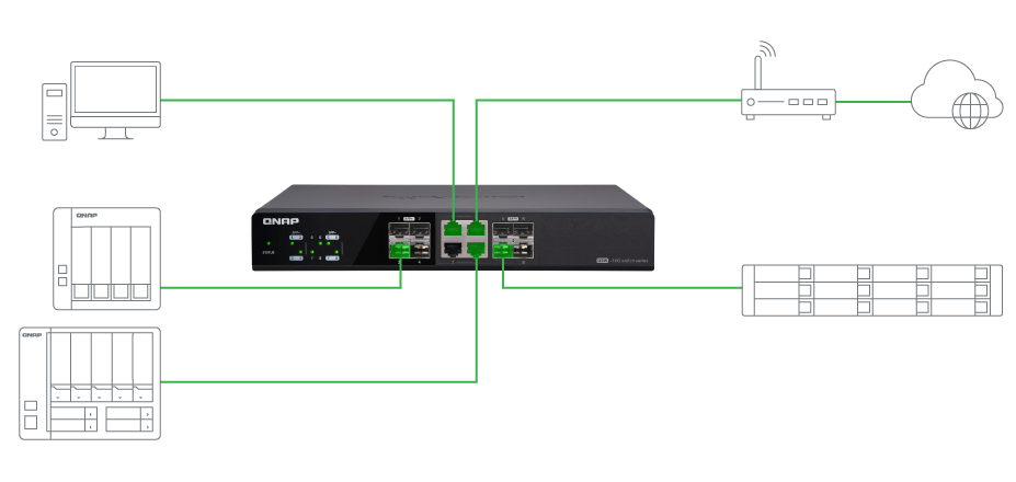 Для предприятий среднего и малого бизнеса, отделов по работе с графическим и видеоконтентом компания QNAP представляет неуправляемый коммутатор QSW-804-4C. Коммутатор поставляется с комплектом креплений для монтажа в 19" стойку и резиновыми ножками для настольного размещения. Общая пропускная способность коммутатора составляет 160 Гбит/с, что позволяет использовать его на узлах, требующих высшей пропускной способностью. Коммутатор является неуправляемым, что позволяет пользователю самостоятельно установить коммутатор и наслаждаться небывалым приростом сетевой производительности.