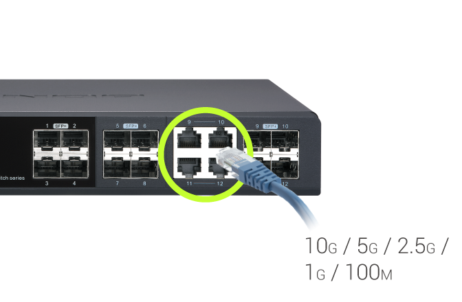 Коммутатор управляемый 10 Гбит/с с 12 портами SFP+, из которых 4 совмещены с RJ-45, пропускная способность до 240 Гбит/с, поддержка JumboFrame.