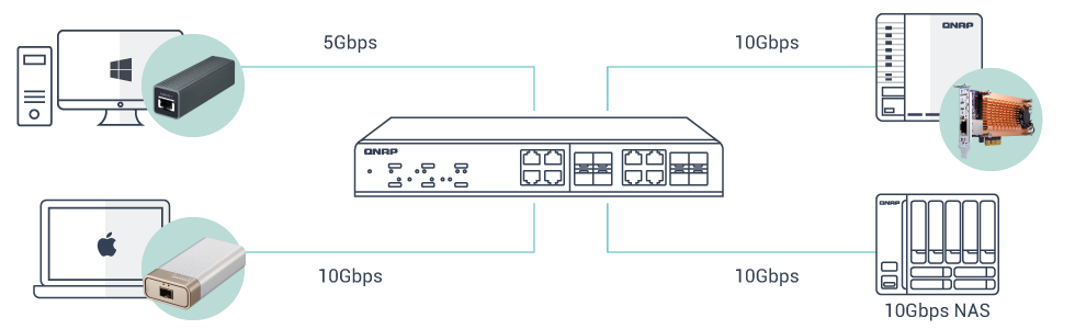 Многие современные сетевые накопители QNAP оснащены 10-гигабитными портами SFP+ и 10GBASE-T в базовой комплектации, а также поддерживают установку дополнительных сетевых адаптеров в слоты PCIe. Также QNAP предлагает адаптеры-переходники Thunderbolt 3–10GbE и USB 3.2 Gen 1–5GbE. Все эти устройства можно использовать вместе с QSW-M1204-4C для создания комплексной сетевой инфраструктуры 10G.