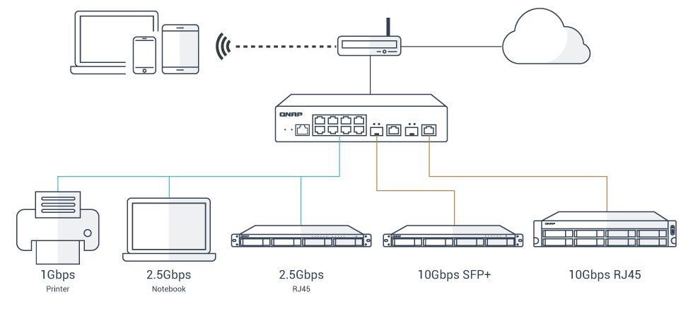 QSW-M2108R-2C имеет коммутационную пропускную способность 80 Гбит/c. К нему можно подключить сетевые накопители на скорости 10 Гбит/c и разнообразные устройства через порты 2,5 Гбит/c, чтобы раскрыть потенциал высокоскоростного подключения к NAS при совместной работе нескольких пользователей.