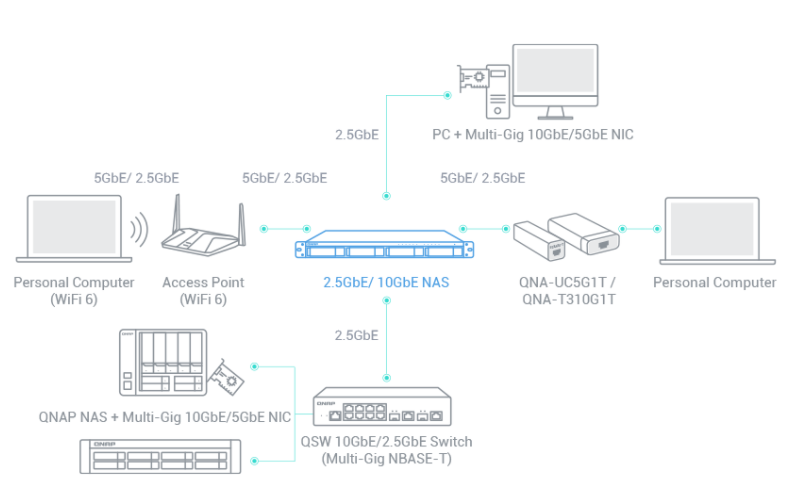 QNAP предлагает широкий спектр сетевых устройств, с помощью которых корпоративные и домашние пользователи могут построить инфраструктуру хранения и обмена данными через соединения на скорости 10 Гбит/с. Через адаптер-переходник от Thunderbolt 3 к 10GbE можно подключить компьютеры, ноутбуки и другие устройства без встроенных сетевых портов.