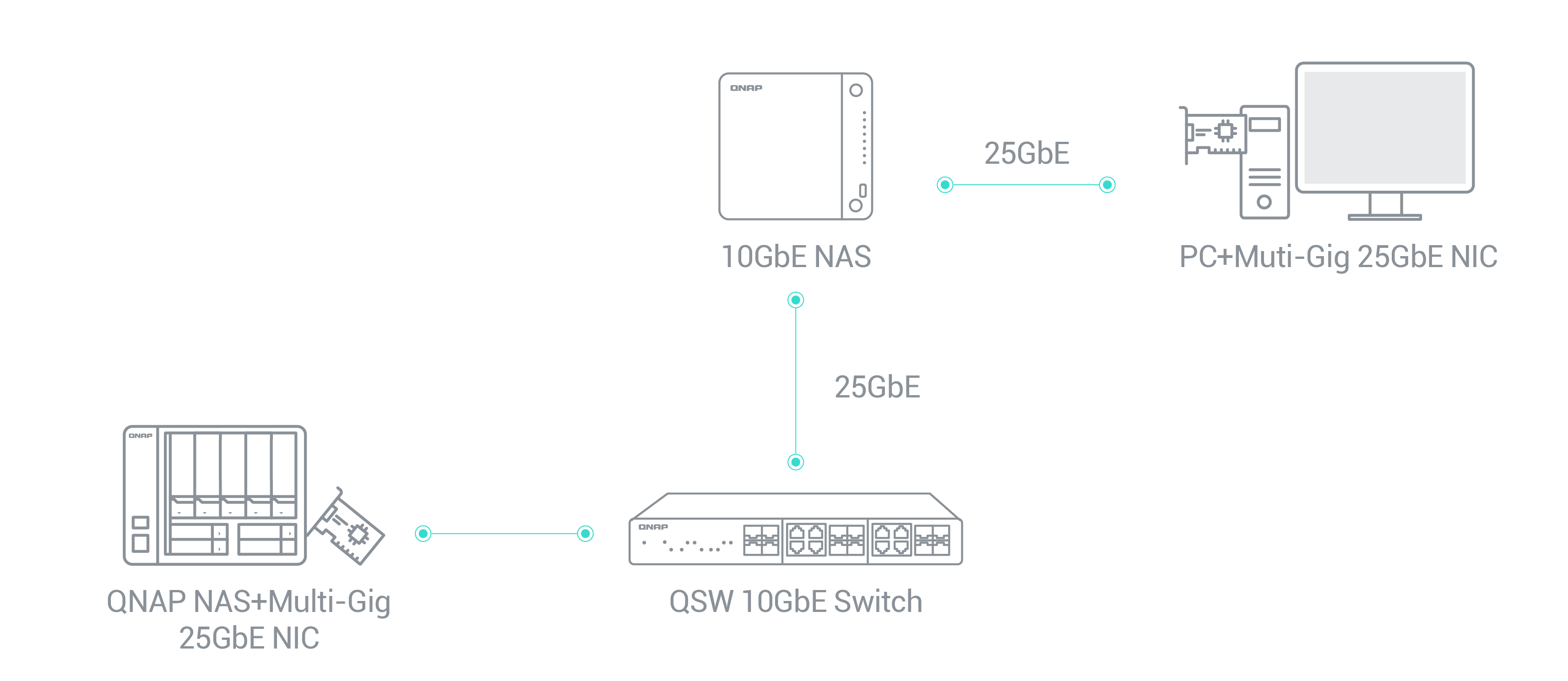 Для создания экономичной высокоскоростной сетевой среды QXG-10G2T-X710 может быть использована с 10-гигабитными коммутаторами QNAP, такими как QSW-M2108-2C или QSW-1208-8C.