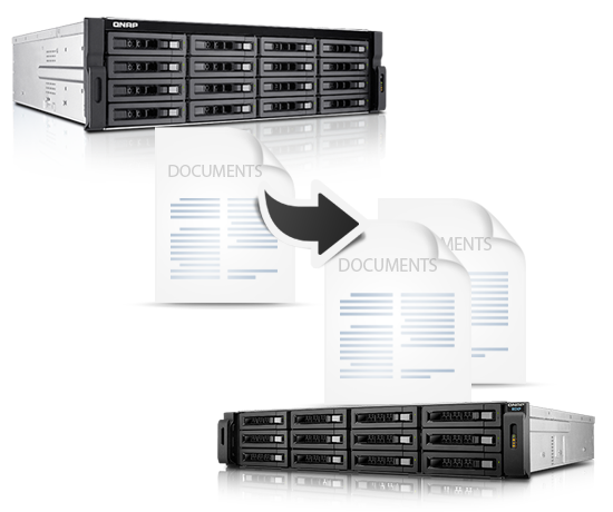 Помимо расширения имеющихся томов, администраторы ИТ могут использовать REXP-1210U-RP в качестве недорогого внешнего хранилища для быстрого и безопасного создания резервных копий данных, хранящихся в системе Turbo NAS. С помощью функции удаленной репликации в реальном времени QNAP RTRR (Real-Time Remote Replication) или службы rsync администраторы могут организовать резервное копирование данных Turbo NAS на модуль REXP-1210U-RP в режиме реального времени или по расписанию.