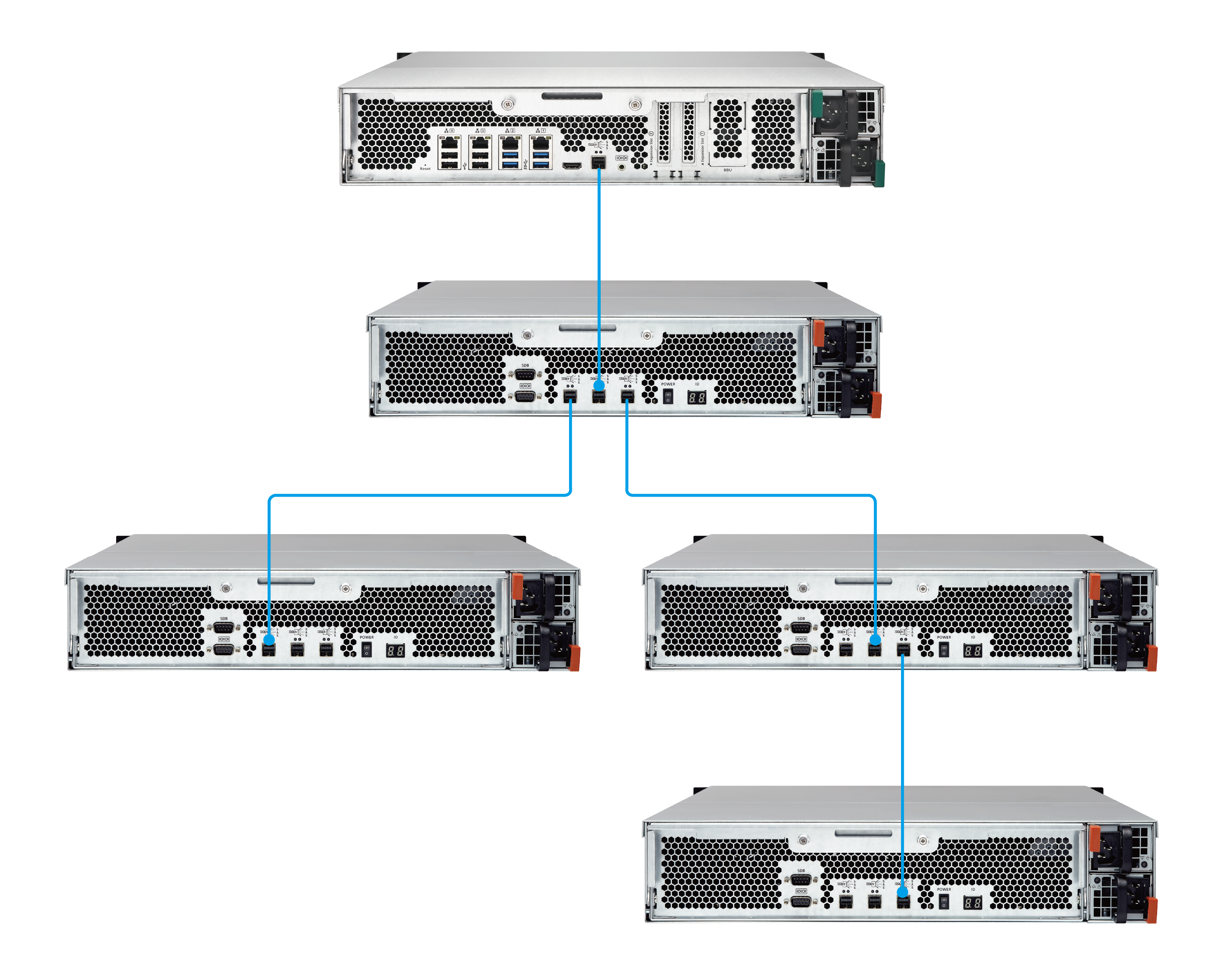 Модуль REXP-1220U-RP оснащен тремя портами SAS для подключения хостов и последовательного соединения соответственно. Каждый широкий порт SAS включает в себя четыре канала SAS, каждый из которых поддерживает скорость 12 Гбит/с в режиме дуплекса. Данное решение обеспечивает беспрецедентную производительность – до 48 Гбит/с на одно соединение с хостом.