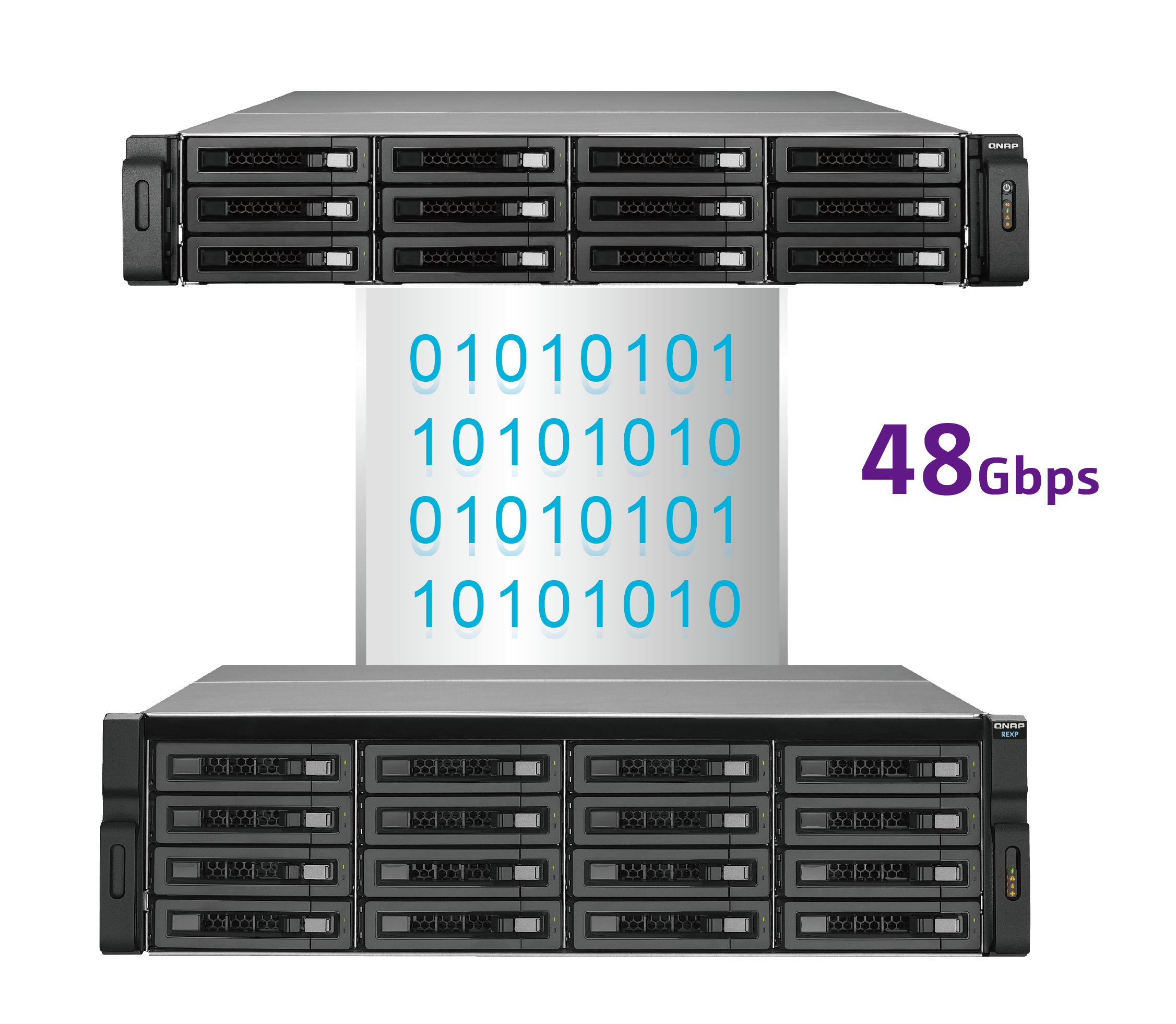 Модуль REXP-1620U-RP оснащен тремя портами SAS для подключения хостов и последовательного соединения соответственно. Каждый широкий порт SAS включает в себя четыре канала SAS, каждый из которых поддерживает скорость 12 Гбит/с в режиме дуплекса. Данное решение обеспечивает беспрецедентную производительность – до 48 Гбит/с на одно соединение с хостом.