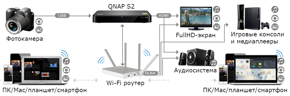 - S2 может взаимодействовать с различными медиаплеерами посредством протокола SMB/CIFS или других стандартных протоколов.