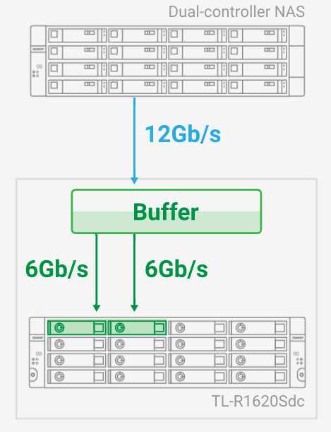 Благодаря технологии Broadcom® SAS DataBolt™ и встроенному буферу TL-R1620Sdc принимает данные на скорости передачи сетевого накопителя. Независимо от скорости дисков (12 или 6 Гбит/с), которыми укомплектован TL-R1620Sdc, NAS будет передавать данные со скоростью 12 Гбит/с, что позволяет максимально эффективно использовать HDD 6 Гбит/с.