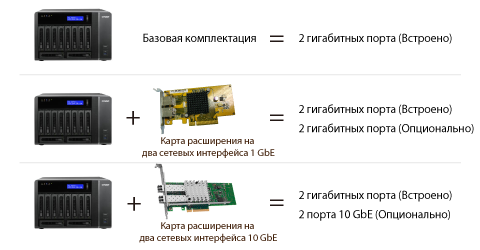 Пропускную способность штатных сетевых интерфейсов можно увеличить при помощи установки дополнительных сетевых карт 10 GbE или 1 GbE.