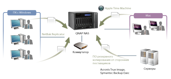 TS-1279U-RP представляет собой решение для надежного резервирования и хранения информации. В системах под управлением ОС Windows репликацию данных можно производить при помощи приложения NetBak Replicator, так же, как Apple Time Machine служит для репликации данных в системах под управлением Mac OS. Часть компаний с уже сложившейся IT- инфраструктурой используют программные продукты сторонних производителей, в том числе Acronis True Image, Symantec Backup Exec и другие. Все эти программы так же поддерживаются платформой NAS от QNAP.
