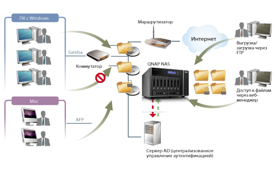 Поддержка Windows AD позволяет получать учетные записи пользователей с сервера Windows AD и импортировать их на сетевой накопитель, тем самым унифицировать доступ к сетевым ресурсам.