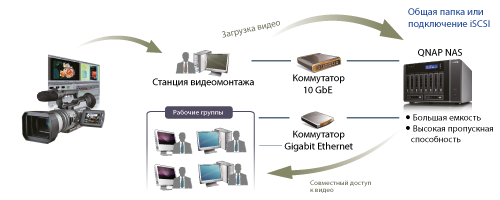Производство цифровых фильмов и видео требует высокой скорости обработки и надежного хранения данных больших объемов. Система Turbo NAS от QNAP, оснащенная высокоскоростным сетевым интерфейсом 10 GbE, позволяет быстро сохранять видеофрагменты и редактировать видеофайлы непосредственно по сети. Одновременное использование файлов может осуществляться клиентами различных операционных систем благодаря поддержке целого ряда протоколов сетевого доступа к файлам, таких, как NFS, AFP, SMB/CIFS. Масштабируемая архитектура NAS позволяет наращивать емкость хранилища по мере роста объемов данных.