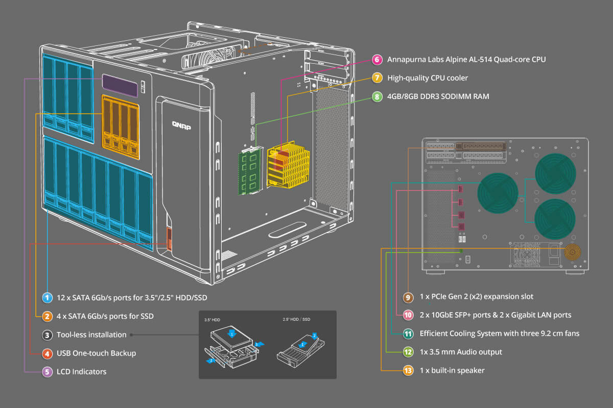 Для создания высокопроизводительной системы хранения данных, которая позволит компаниям постепенно наращивать дисковую емкость, компания QNAP представляетTS-1635AX. Шасси системы выполнено в настольном исполнении и включает 12 слотов для подключения 3,5”/2,5” SATA жестких дисков или SSD, 4 отсека для 2,5” SSD и два слота M.2 SSD. Дисковый массив обслуживает 64-битный четырехъядерный процессор ARMv8 ARMADA 8040 Cortex-A72 с тактовой частотой 1,6 ГГц и 8 гигабайтами производительной памяти DDR4, расширяемой до 16 Гбайт. Устройство оснащено двумя гигабитными портами RJ45 и двумя десятигигабитными SFP+. Подключение периферийных устройств, внешних съемных дисков или принтеров возможно через 3 порта USB 3.2 Gen 2. Для наращивания функционала доступны два слота PCIe, которые позволят подключить интерфейсные платы расширения беспроводной связи, 10 Гбит сетевые карты.