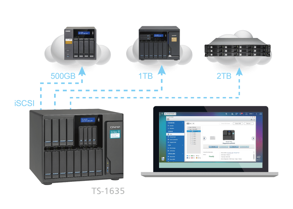 В качестве iSCSI/IP-SAN решений, TS-1635AX поддерживает платформы VMware и Citrix, а так же совместим с Microsoft Hyper-V и Windows Server 2012 R2, обеспечивая гибкое размещение и управление хранилищем в средах виртуализации. Также, TS-1635AX поддерживает компоненты VMware VAAI и Microsoft ODX для повышения производительности системы за счёт переноса нагрузки с гипервизоров ESXi и Hyper-V. Улучшена эффективность и управление плагина QNAP vSphere Client и модуля QNAP SMI-S Provider в приложениях виртуализации.
