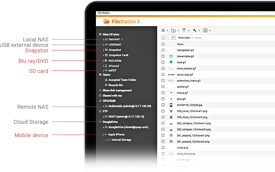 File Station — это базовое веб-приложение QTS для управления файлами с такими возможностями как: загрузка на NAS простым перетаскиванием мыши, перемещение между папками, переименование и удаление, настройка прав доступа для пользователей и легкий обмен ссылками. При помощи Microsoft Office Online вы можете открывать и изменять документы Word, Excel и PowerPoint, хранящиеся на TS-231P3, без необходимости скачивания с сетевого хранилища на ПК.