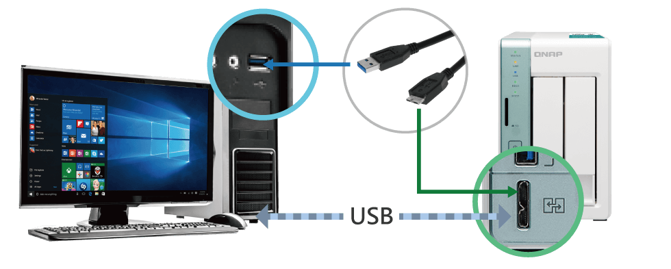 Подключите компьютер напрямую к USB-порту с опций QuickAccess и получите мгновенный доступ к данным внутри хранилища через утилиту Qfinder Pro. Для обеспечения безопасности существует три режима аутентификации, которые настраиваются в разделе интерфейса QTS «Сеть и виртуальный коммутатор»:
