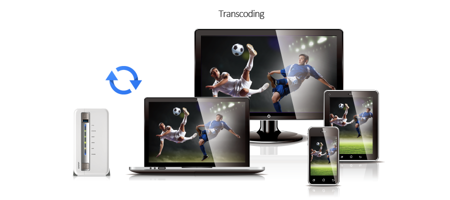 Хранилище TS-251C умеет в режиме реального времени транскодировать Full HD-видео в форматы, поддерживаемые для воспроизведения на компьютерах, мобильных устройствах и телевизорах. Аппаратное транскодирование позволяет пяти устройствам одновременно проигрывать различные видео с накопителя. Таким образом, TS-251C позволяет просматривать видео на нескольких устройствах, даже таких, которые не имеют большой вычислительной мощности или не поддерживают те или иные форматы, – без необходимости делать сложную и длительную перекодировку файлов. Если скорость доступа в Интернет ограничена, вы можете удаленно просмотреть видеофайл без задержек, выбрав предварительно созданную копию с пониженным разрешением в файловом менеджере File Station, сервисе Video Station или мобильном приложении Qfile для iOS и Android, что не влияет на производительность других функций на устройстве.