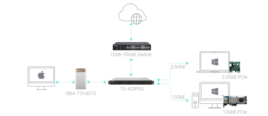TS-432PXU-RP оснащен двумя сетевыми портами 2,5 Гбит/c RJ45, к которым подключаются существующие кабели CAT5e, при этом скорость сети повышается с 1 Гбит/с до 2,5 Гбит/с. Порты также поддерживают транкинг для повышения скорости передачи данных до 5 Гбит/с. С помощью адаптера QNAP N-BASET / Multi-Gig USB 3.2 Gen 1 - 5GbE или карт расширения PCIe 5 GbE можно подключить ноутбук или настольный компьютер к сетям 2,5 Гбит/c совместно с TS-432PXU-RP. Так-же накопитель TS-432PXU-RP оснащен двумя встроенными портами 2,5 Gigabit Ethernet и двумя высокоскоростными сетевыми интерфейсами на 10 Гбит/с SFP+. Поддерживающая стандарт 10GbE, модель TS-432PXU-RP обеспечивает исключительно высокую пропускную способность. В сочетании с поддержкой высокой емкости хранилища накопитель TS-432PXU-RP идеально подходит для центров обработки данных благодаря умению работать с большими объемами данных и обеспечивать высочайшую скорость передачи данных, а также для редактирования видеофайлов большого размера "на лету", не пересылая их туда и обратно между накопителем TS-432PXU-RP и настольными компьютерами.