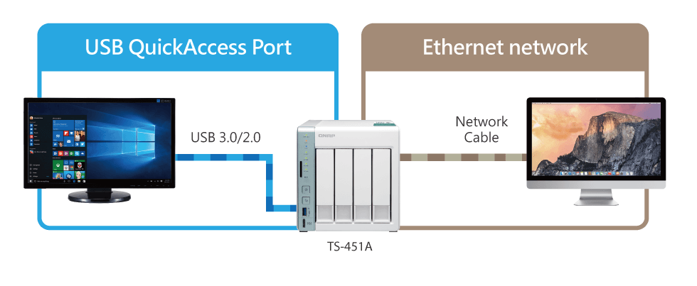 Накопитель TS-451A имеет на борту USB–порт с опцией QuickAccess для первоначальной настройки устройства и прямого доступа к хранящимся файлам, что дополняет традиционные методы с использованием сети.