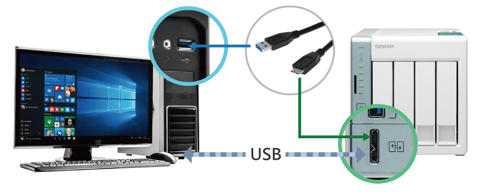 Порт USB QuickAccess позволяет быстро осуществить начальную настройку и запуск устройства в работу без доступа по сети. С помощью утилиты Qfinder Pro* можно получить прямой доступ к хранящимся данным, подключившись входящим в комплект кабелем USB 3.2 Gen 1 или опциональным USB 2.0 (micro-B)**, как при работе с обычным внешним USB-диском. При этом в целях безопасности предусмотрено разграничение прав пользователей для исключения несанкционированного доступа.