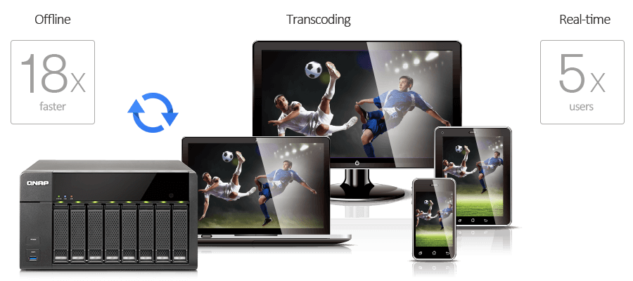 Хранилище TS-651 умеет в режиме реального времени транскодировать Full HD-видео в форматы, поддерживаемые для воспроизведения на компьютерах, мобильных устройствах и телевизорах. Аппаратное транскодирование позволяет пяти устройствам одновременно проигрывать различные видео с накопителя. Таким образом, TS-651 позволяет просматривать видео на нескольких устройствах, даже таких, которые не имеют большой вычислительной мощности или не поддерживают те или иные форматы, – без необходимости делать сложную и длительную перекодировку файлов. Если скорость доступа в Интернет ограничена, вы можете удаленно просмотреть видеофайл без задержек, выбрав предварительно созданную копию с пониженным разрешением в файловом менеджере File Station, сервисе Video Station или мобильном приложении Qfile для iOS и Android, что не влияет на производительность других функций на устройстве.