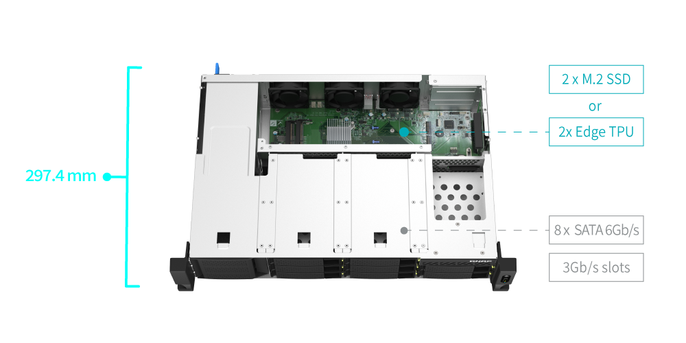 TS-873AeU — это компактное стоечное сетевое хранилище высотой 2U, оснащенное четырехъядерным процессором AMD Ryzen™ серии V1000 V1500B с восемью потоками и тактовой частотой 2,2 ГГц, а также двумя сетевыми портами 2,5 Гбит/c. По сравнению с предыдущим поколением, в TS-873AeU добавлены два слота NVMe SSD M.2 PCIe Gen3 x1 для организации кэширования или быстрого уровня хранения данных. Современное аппаратное обеспечение совместно с комплексными программными решениями делает TS-873AeU лучшим выбором для решения таких ресурсоемких задач, как виртуальные машины или интенсивный многопользовательский доступ. Компактная конструкция малой глубины упрощает установку в монтажные стойки.