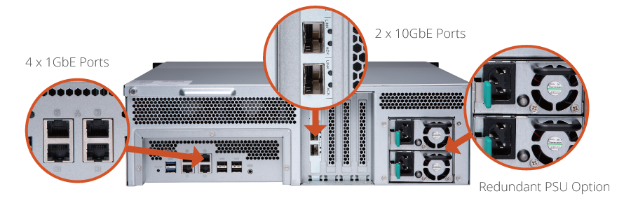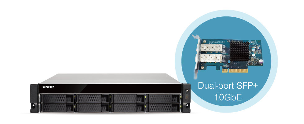 Накопитель TS-873U-RP поддерживает работу в высокоскоростной сетевой среде 10 Gigabit Ethernet и имеет встроенный двухпортовый 10GbE SFP+ PCI адаптер, гарантирующий впечатляющую производительность при работе, как с медными, так и с оптическими трансиверами. В сочетании с высокой емкостью хранилища накопитель TS-873U-RP идеально подходит для центров обработки данных благодаря умению работать с большими объемами данных, задач виртуализации, а также для редактирования видеофайлов большого размера "на лету", не пересылая их между накопителем TS-873U-RP и настольными компьютерами дважды.