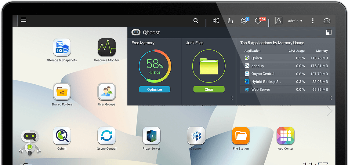 Благодаря модульным приложениям и функциям QTS повышает эффективность управления устройством, персональную производительность и открывает широкие возможности мультимедиа и многое другое, делая ваш NAS более простым, эффективным и гибким! Встроенный центр приложений с сотнями приложений для установки по требованию, реализует практически неограниченные функции NAS. Новый Qboost предоставляет инструмент оптимизации NAS, ускоряющий работу приложений и распределяющий системные ресурсы между ними. QTS разрушает барьеры между устройствами, платформами и расстояниями, обеспечивая облачные сервисы с расширенным функционалом.