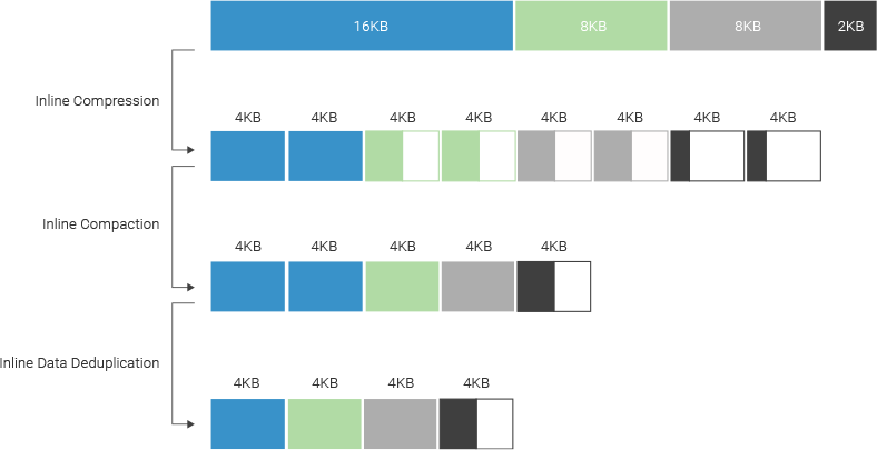 ![]() | Объединение записи Преобразование случайных записей в последовательные в реальном времени сокращает количество операций ввода-вывода и увеличивает производительность записи all-flash. |