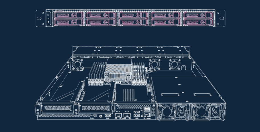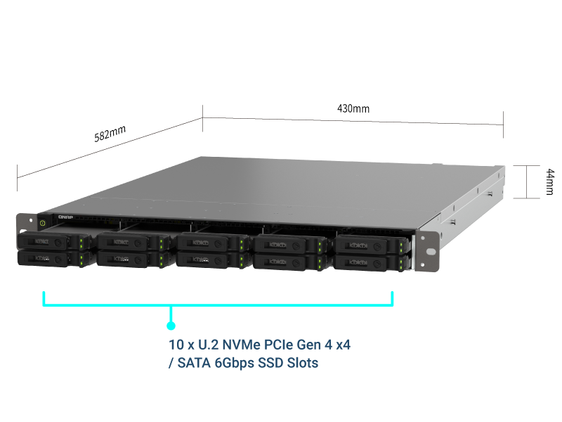 TS-h1090FU имеет десять 2,5-дюймовых слотов, которые поддерживают высокопроизводительные твердотельные накопители U.2 NVMe PCIe Gen 4 x4 или экономичные SSD SATA 6 Гбит/с. Используйте дисковое пространство на основе твердотельных накопителей U.2 NVMe PCIe Gen 4 x4 для приложений, которые требуют высокую пропускную способность.