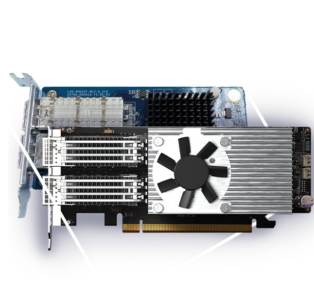 Базовая комплектация TS-h1090FU предлагает сетевое подключение через два сетевых порта 25 Гбит/c SFP28 SmartNIC, которые также поддерживают расширения RDMA (iSER) для iSCSI это позволяет повысить производительность передачи данных между NAS и сервером VMware® ESXi и разгрузить ЦП.