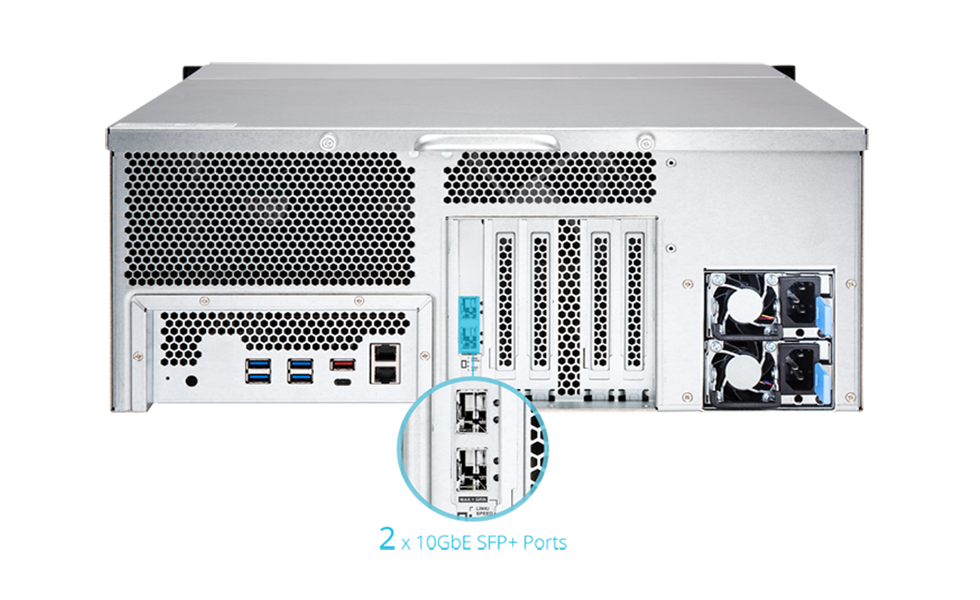 Сетевое хранилище TS-h2477XU-RP оснащено двумя 10-гигабитными портами SFP+ SmartNIC (с контроллером NVIDIA® Mellanox ConnectX-4 Lx SmartNIC) и поддерживают протокол iSCSI Extensions for RDMA (iSER), который обходит уровни драйверов и сокетов для прямого обмена блоками данных между оперативной памятью сервера ESXi и хранилища. Эта технология снижает нагрузку на центральный процессор и более эффективно использует имеющуюся полосу пропускания канала передачи данных. Применение NAS с поддержкой iSER является одним из инструментов, который оптимизирует работу приложений виртуализации.