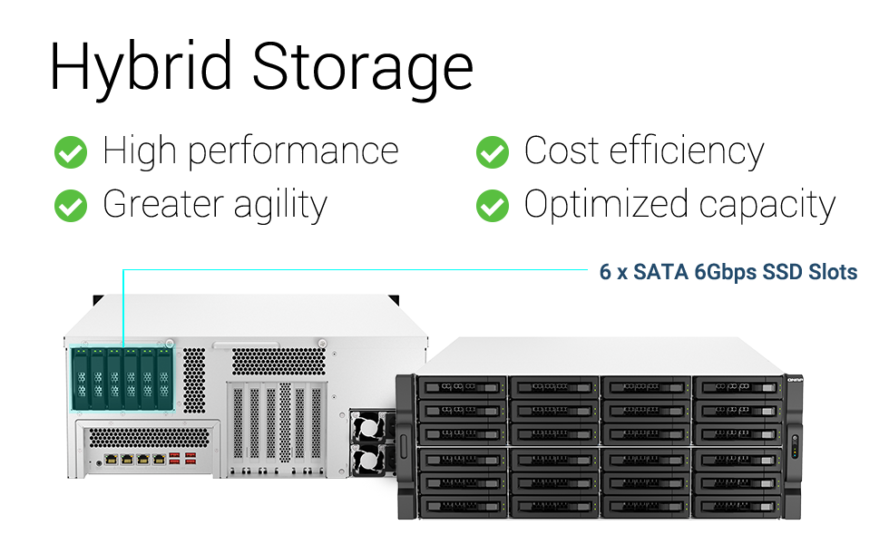 По сравнению с традиционными массивами хранения гибридный накопитель TS-h3087XU-RP обеспечивает оптимальный баланс между стоимостью, производительностью и емкостью дисковой подсистемы. Оснащенный двадцатью четырьмя 3,5-дюймовыми отсеками SATA 6 Гбит/с для жестких дисков и шестью 2,5-дюймовыми слотами SATA 6 Гбит/с для твердотельных накопителей, TS-h3087XU-RP поддерживает кэширование на основе SSD для корректной работы приложений с высокими требованиями к операциям ввода-вывода.