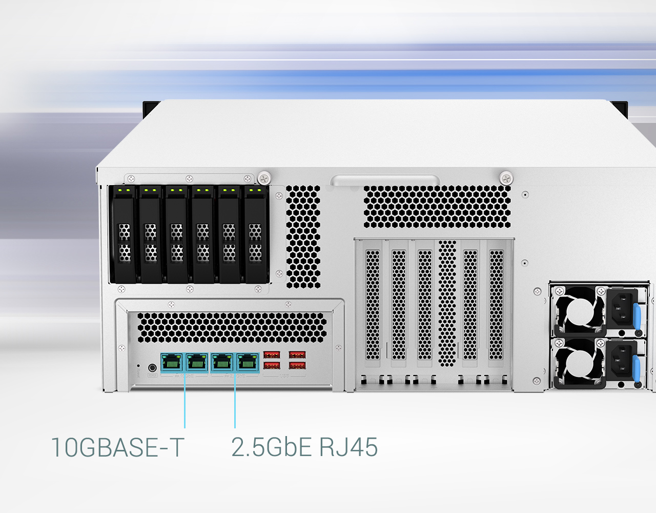 TS-h3087XU-RP оснащен двумя портами 2,5 Гбит/c RJ45 (обратно совместимыми с 1 Гбит/c и 100 Мбит/c) и двумя портами 10 Гбит/с RJ45. Объединение портов и поддержка аварийного переключения увеличивают пропускную способность и надежность доступа приложений, включая виртуализацию, передачу больших файлов, высокоскоростное резервное копирование/восстановление и приложения, работающие в реальном времени. QNAP также предлагает множество вариантов управляемых и неуправляемых коммутаторов 10 и 2,5 Гбит/c , помогая организациям внедрять высокоскоростные, безопасные и масштабируемые сетевые среды.