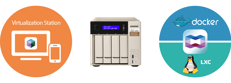 На TVS-473 при помощи сервиса Virtualization Station можно разместить виртуальные машины (ВМ), доступные для работы через веб-браузеры или VNC. Функциональность станции включает быстрое создание, выполнение резервных копий и моментальных снимков, восстанавление, импорт и экспорт, а также интерфейс централизованного управления ВМ. Хранилище и станция виртуализации способны разделять одни и те же сетевые порты между собой. Высокопроизводительный виртуальный коммутатор повышает эффективность обмена, как напрямую между ВМ, так и между ВМ и накопителем через внутренний интерфейс. Также TVS-473 поддерживает установку видеоадаптеров AMD Radeon R7 и RX 480 со сквозной передачей их мощностей ВМ для работы с приложениями, предъявляющими высокие требования к графическим вычислениям и преобразованиям.