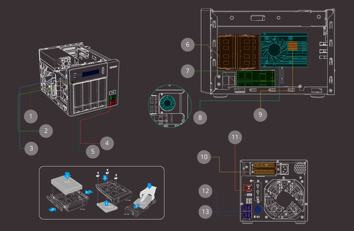 TVS-473e работает под управлением 64-битной операционной системы QTS и готов к любыми испытаниям благодаря процессору AMD с модулем ускорения вычислений и графическому ядру AMD Radeon R7, что в сочетании позволяет добиться высокой производительности с минимальными энергозатратами. Стильный дизайн накопителя подчеркивает его действительно впечатляющие характеристики, среди которых мощный четырехядерный центральный процессор, возможность расширение оперативной памяти до 64 ГБ и опциональная поддержка модуля 10 Гбит Ethernet. Наряду с уже перечисленными особенностями, устройство имеет порт USB QuickAccess, два HDMI 4K интерфейса, поддерживает потоковое кодирование и декодирование 4K контента, олицетворяя собой пример хорошо сбалансированного решения для задач виртуализации и работы с видео контентом высокого качества.