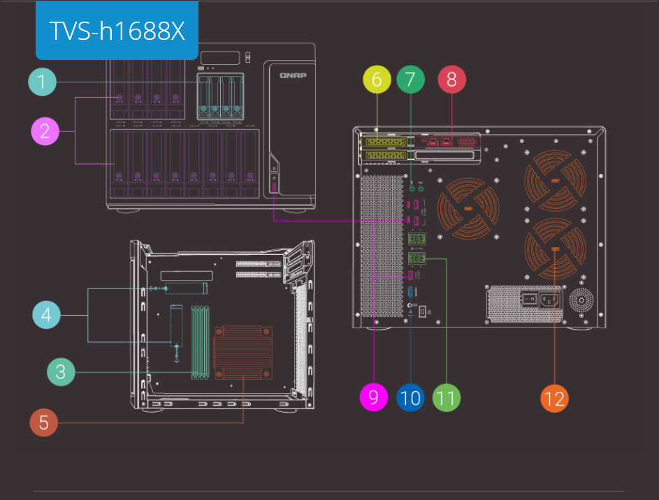 TVS-h1688X имеет четыре 2,5-дюймовых отсека для твердотельных накопителей SATA 6 Гбит/c и два слота для твердотельных накопителей M.2 NVMe Gen 3 x4. Такая архитектура помогает гибко настроить кэширование или создать скоростной массив для приложений, требовательных к производительности операций ввода-вывода. В сочетании с высокоскоростными сетевыми интерфейсами, это дает отличные результаты при работе с базами данных и приложениями виртуализации. Благодаря выделенным отсекам и слотам для твердотельных накопителей, все 3,5-дюймовые отсеки при необходимости остаются для жестких дисков большой емкости, что обеспечивает как максимальную емкость, так и высокую производительность решения на базе TVS-h1688X.